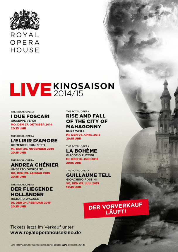 Das bedeutendste britische Opernhaus lädt am 27.10.2014 erstmals bei uns zur Royal Opera Saison 2014/15 ein! Erleben Sie sieben Opern-Meisterwerke live aus dem Covent Garden in London auf der großen Kinoleinwand - in brillanter Bild- und Tonqualität. Die aktuelle Royal Opera House Saison verspricht meisterhafte Opernunterhaltung auf höchstem Niveau und ein Wiedersehen mit Weltstars wie Anna Netrebko und Plácido Domingo. Lassen Sie sich vom Feinsten verführen: Verdi´s I Due Foscari, Wagner's Der fliegende Holländer oder Puccini's Meisterwerk La Bohème sind nur einige der insgesamt sieben live übertragenen Highlights aus dem renommierten Opernhaus in London.