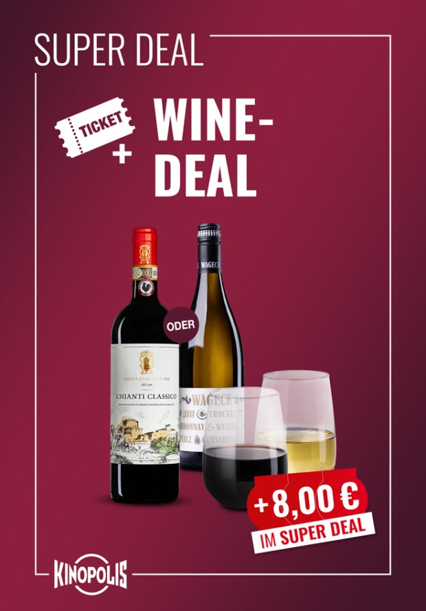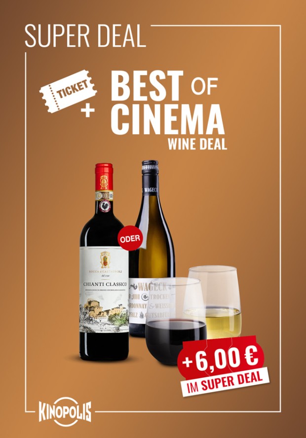 Das Super Deal Snack´n Wine Menü – Ticket für Deinen Kinobesuch + einen Getränkegutschein für 0,375l Weiß- oder Rotwein deiner Wahl.