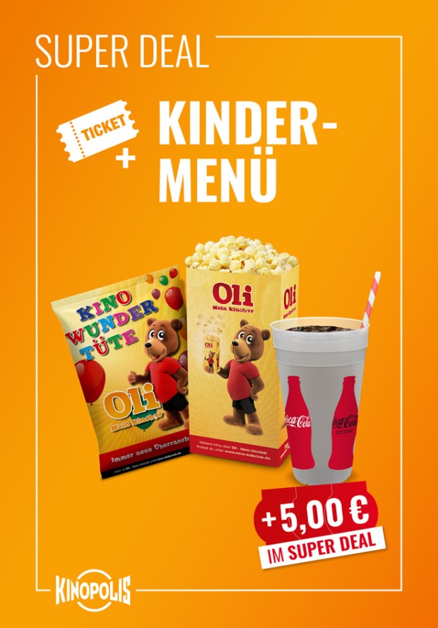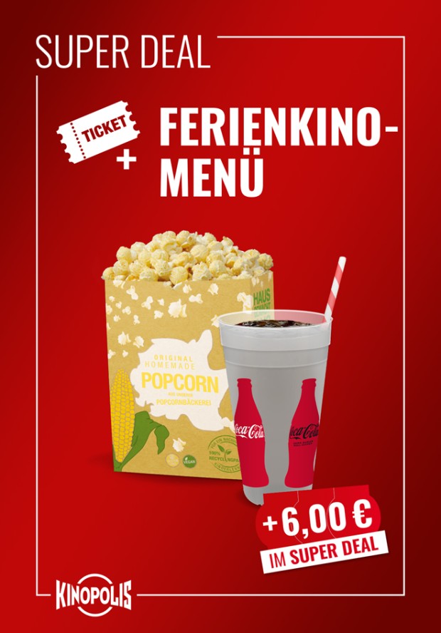 Ferienkino – Ticket für Deinen Kinobesuch + einen Getränkegutschein für 0,75l Softgetränk + einen Snackgutschein für eine mittlere Portion unseres homemade Popcorns. Deinen Snackgutschein kannst Du flexibel einsetzen: Beim Kauf eines unserer anderen Kinomenüs, verrechnen wir Deinen Gutschein - so sparst Du in jedem Menü doppelt! Wähle aus unseren Popcorn-, Nacho- oder Alles-Drin-Menüs.*