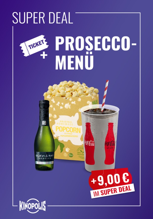 Das Super Deal Prosecco Menü – Ticket für Deinen Kinobesuch + einen Getränkegutschein für 0,5l Softgetränk + einen Snackgutschein für eine mittlere Portion unseres homemade Popcorns + eine Piccoloflasche 0,2l Scavi & Ray Prosecco frizzante.