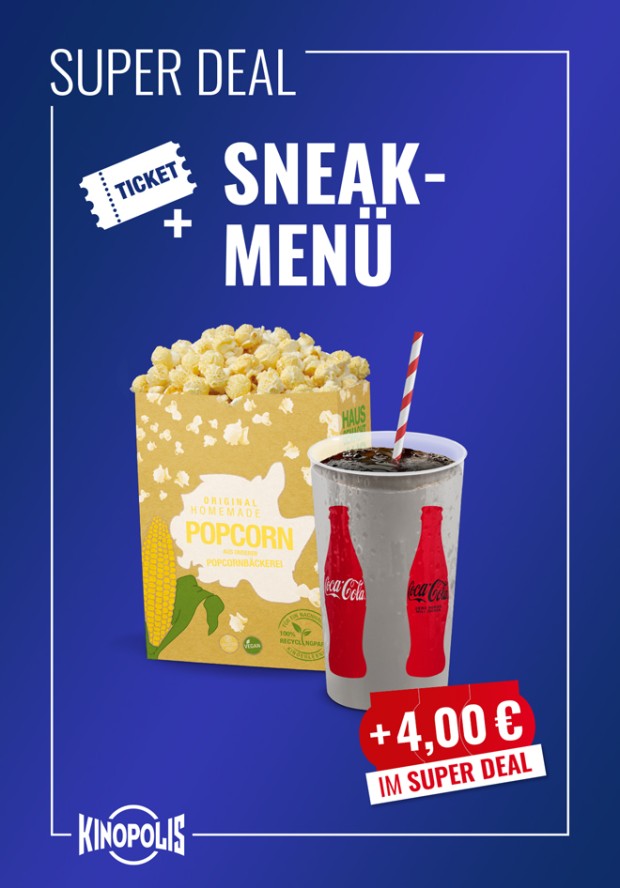 Ticket für Deinen perfekten Sneakabend im Kino + Snackgutschein für ein Softdrink 0,75 l nach Wahl und eine mittlere Portion unseres homemade Popcorns. Deinen Snackgutschein kannst Du flexibel einsetzen: Beim Kauf eines Menüs Deiner Wahl, verrechnen wir Deinen Gutschein - so sparst Du in jedem Menü doppelt!