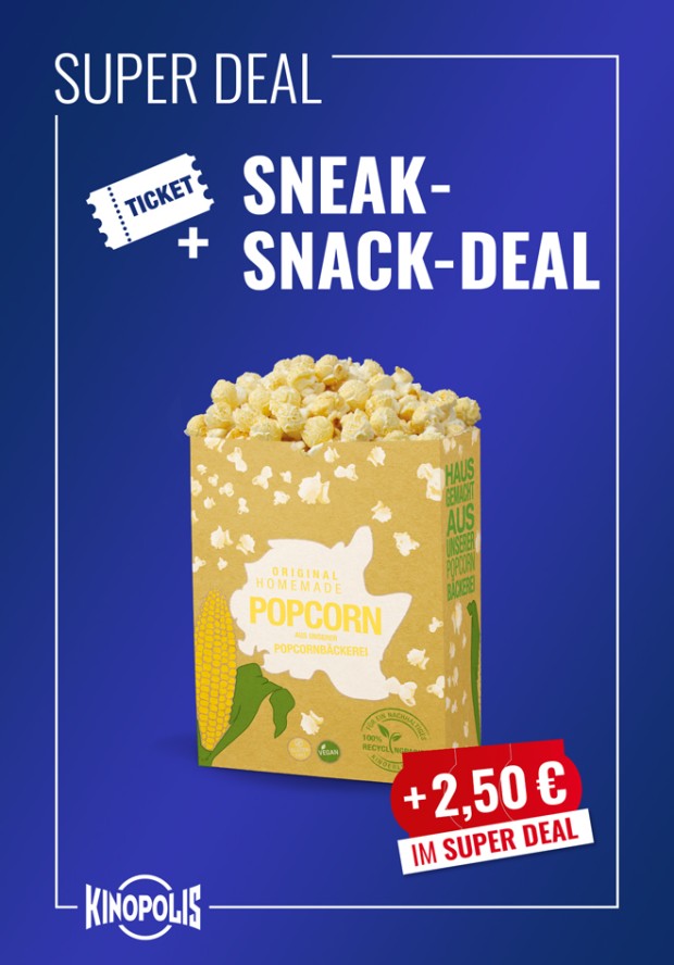 Ticket für Deinen perfekten Sneakabend im Kino + Snackgutschein für eine mittlere Portion unseres homemade Popcorns. Deinen Snackgutschein kannst Du flexibel einsetzen: Beim Kauf eines Menüs Deiner Wahl, verrechnen wir Deinen Gutschein - so sparst Du in jedem Menü doppelt!