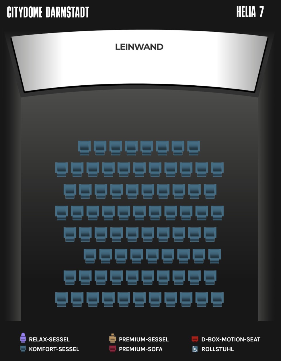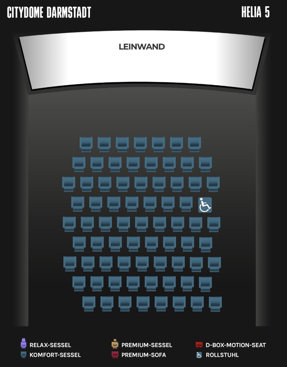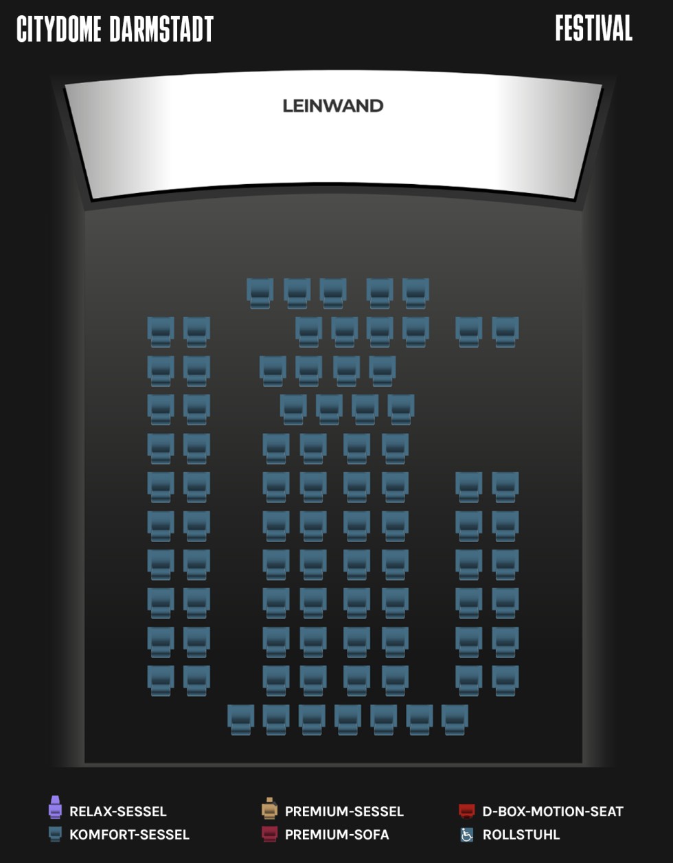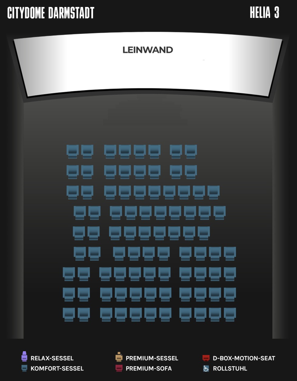 Sitzplätze:109 (davon 23 Premium-Sessel, 10 D-Box Seats + 1 Rollstuhlplatz)