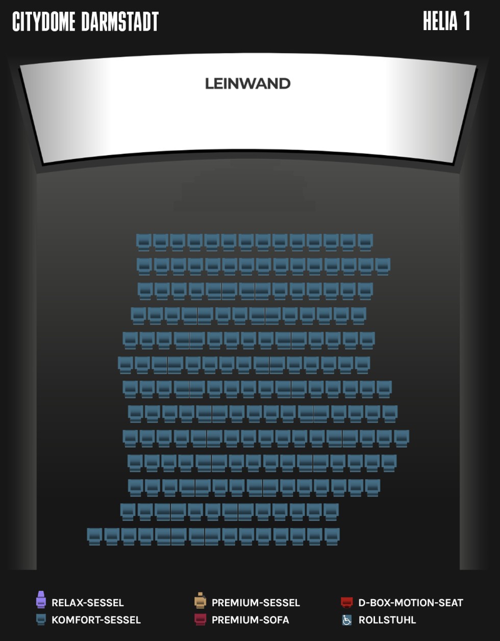 Sitzplätze:134 (davon 24 Premium-Sessel, 12 D-Box Seats + 1 Rollstuhlplatz)