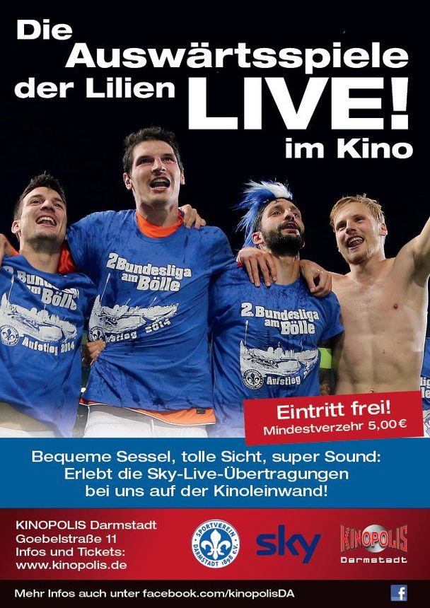 Das Kinopolis Darmstadt bringt die Auswärtsspiele des SV Darmstadt 98 nach Darmstadt! Auf der großen Kinoleinwand, einem Tonerlebnis wie im Stadion und gestochen scharfem Bild können Lilienfans die Auswärtsspiele in der Sky-Liveübertragung ab sofort im Kino erleben. Der Eintritt ist frei, Mindestverzehr beträgt 5?. Der Ticketverkauf für die jeweiligen Spiele beginnt, sobald die Spiele terminiert sind.