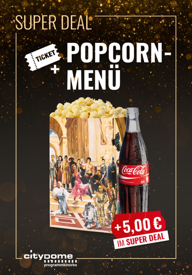 Das Super Deal Popcorn Menü – Ticket für Deinen Kinobesuch + einen Getränkegutschein für 0,5l Softgetränk + einen Snackgutschein für eine Portion unseres homemade Popcorns. Deinen Snackgutschein kannst Du flexibel einsetzen: Beim Kauf eines unserer anderen Kinomenüs, verrechnen wir Deinen Gutschein - so sparst Du in jedem Menü doppelt! Wähle aus unseren Popcorn- & Nacho-Menüs.