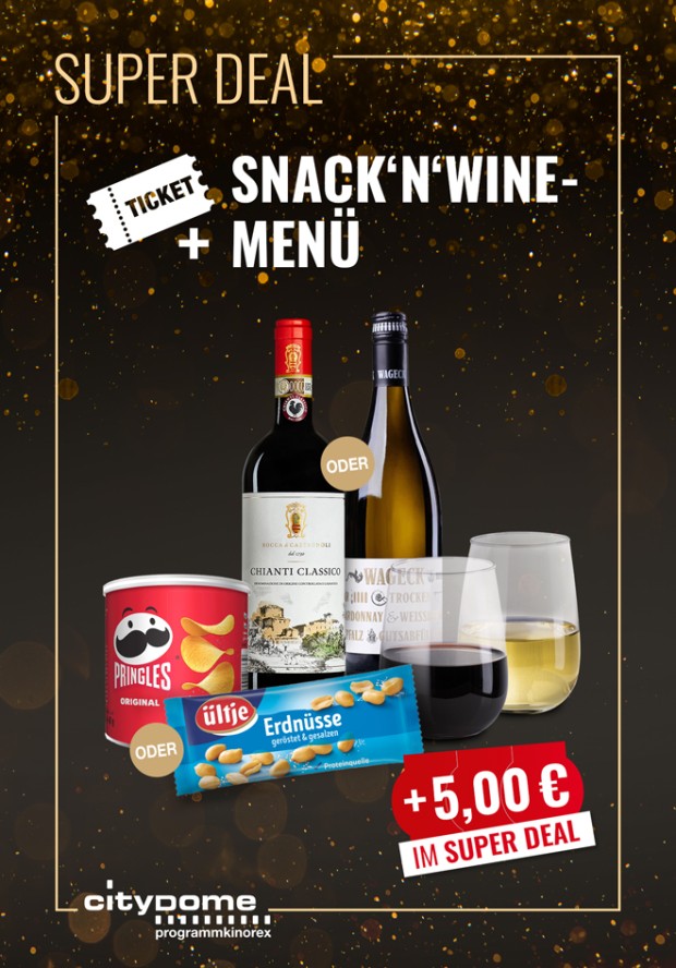 Das Super Deal Snack´n´Wine Menü – Ticket für Deinen Kinobesuch + einen Getränkegutschein für ein Glas Weiß- oder Rotwein deiner Wahl + einen Snackgutschein für eine Portion unserer Pringles oder Ültje Snacknüsse.